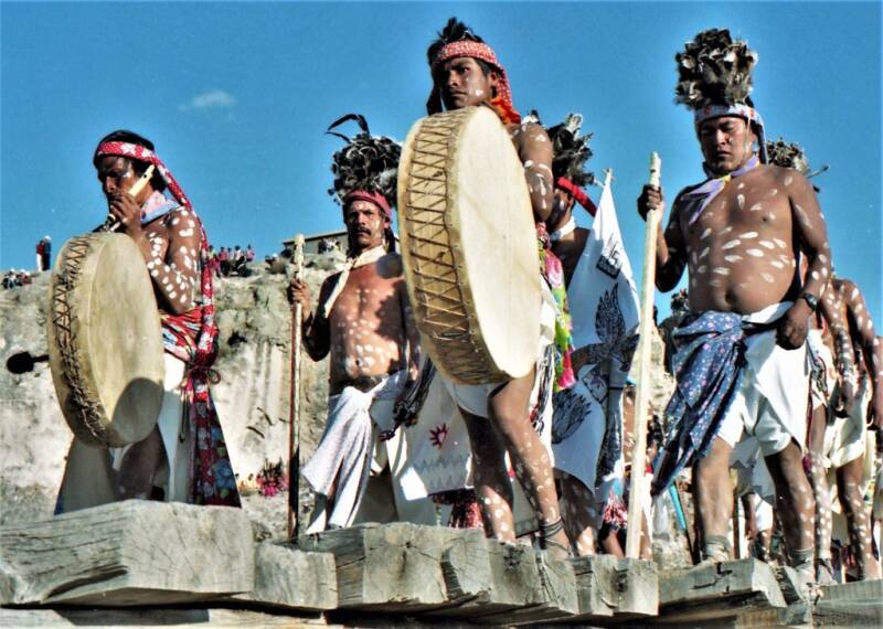 Desde los días previos al Jueves Santo se oyen aproximarse los tambores de los grupos que van bajando desde las rancherías a la iglesia. Se montan doce arcos de madera adornados con plantas alrededor de la iglesia y se hacen ofrendas de flores y comida a los santos representados en el interior.