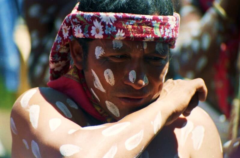 Los danzantes se adornan el cuerpo y la cara con pinturas blancas y rojas que representan otra dualidad, lo masculino – el blanco- y lo femenino -el rojo-. Se cubren la cabeza con coronas de plumas de pavo o usan la cinta tradicional para sujetar el pelo.